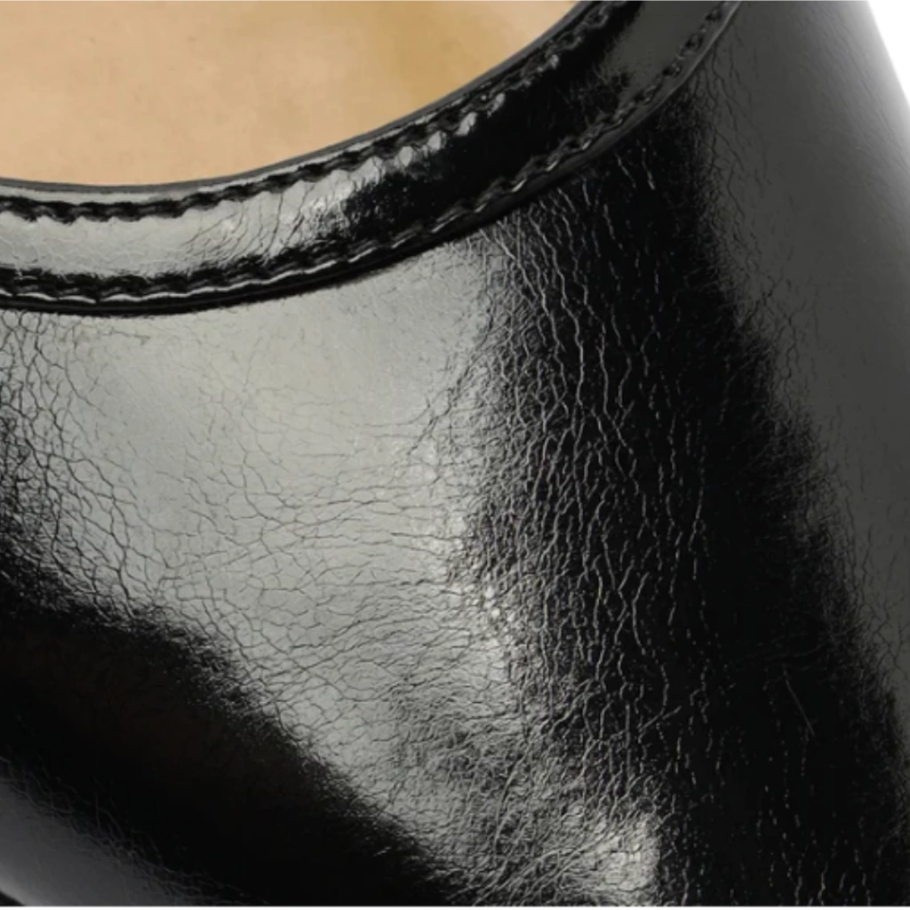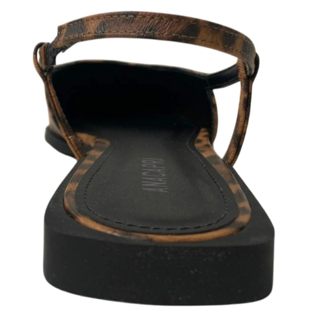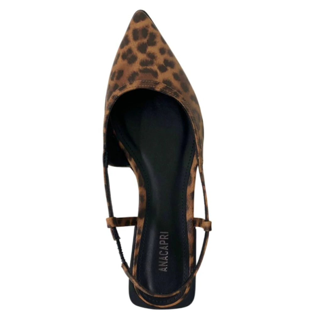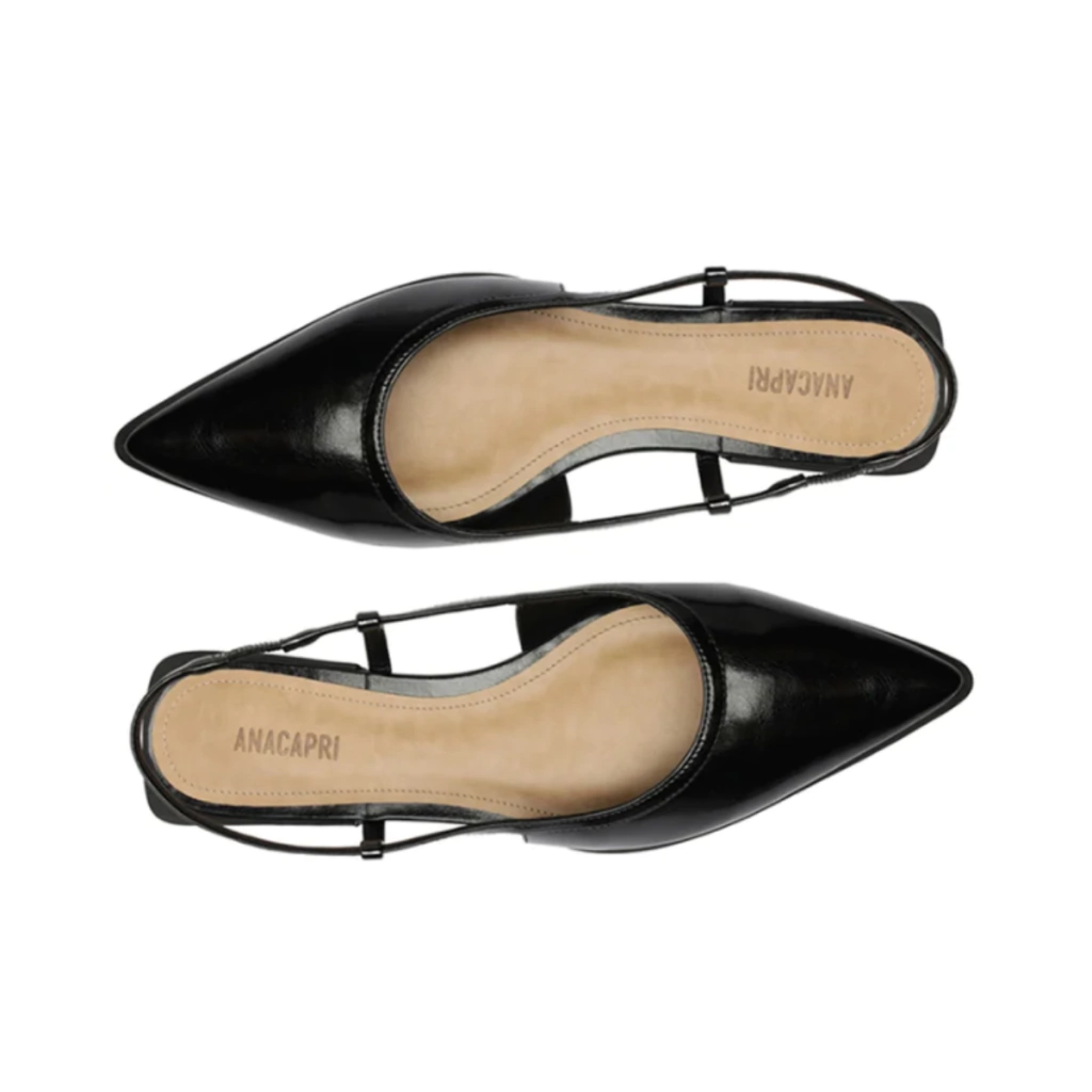 Sapatilha slingback Carrie, na cor preta. O modelo possui solado rasteiro e emborrachado, com leve saltinho traseiro e bico fino. De material similar ao couro com efeito envernizado, apresenta contorno em fita com detalhe pespontado, no mesmo tom da sapatilha. Traz cabedal com recorte arredondado sobre o peito do pé, com shape ajustado nas laterais. Aberta atrás - estilo slingback - possui tiras finas conectadas ao cabedal presas pelas laterais, que contornam o calcanhar com fecho lateral em fivela ajustável. Com palmilha nude e assinatura Anacapri. O modelo deixa o peito de pé e calcanhar à mostra.