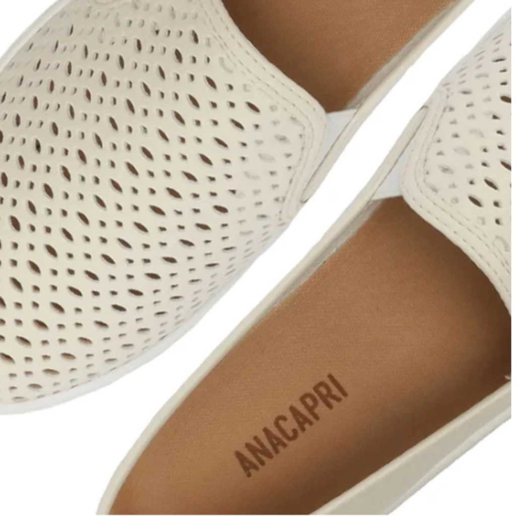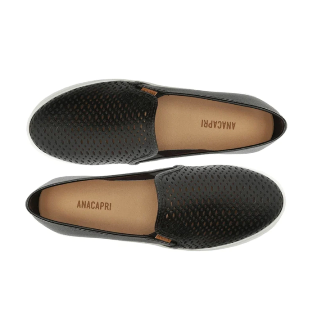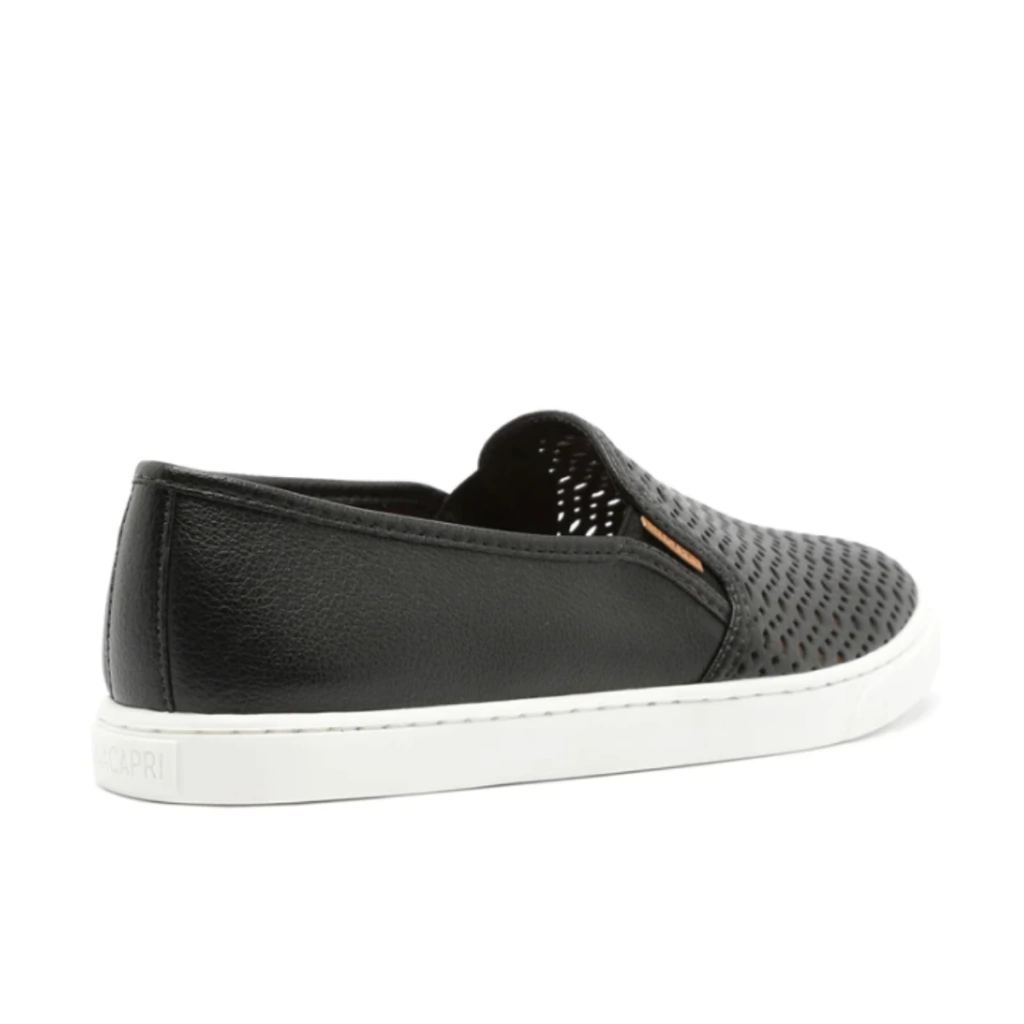 Tênis Slip On Ana preto, com solado branco flat. De material Eco Montreal Vegano com recorte a laser na gáspea e fechado no restante do cabedal. Fechado no calcanhar também. Recortado na pala, traz elásticos que facilitam o calce.