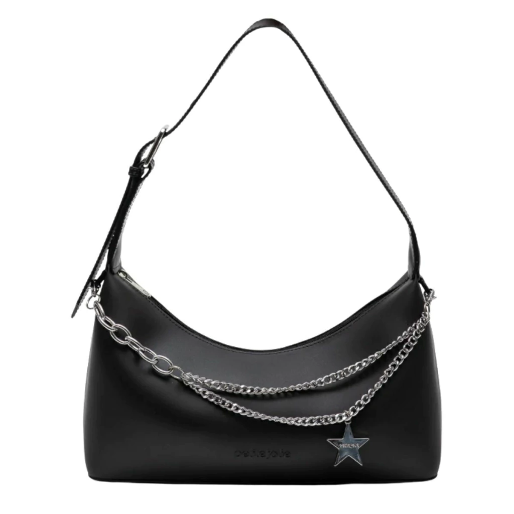 O grande destaque fica por conta da correntaria frontal com pingente de estrela, que pode ser removida e usada também como acessório em calças ou até como colar, deixando o visual ainda mais versátil e cheio de estilo.