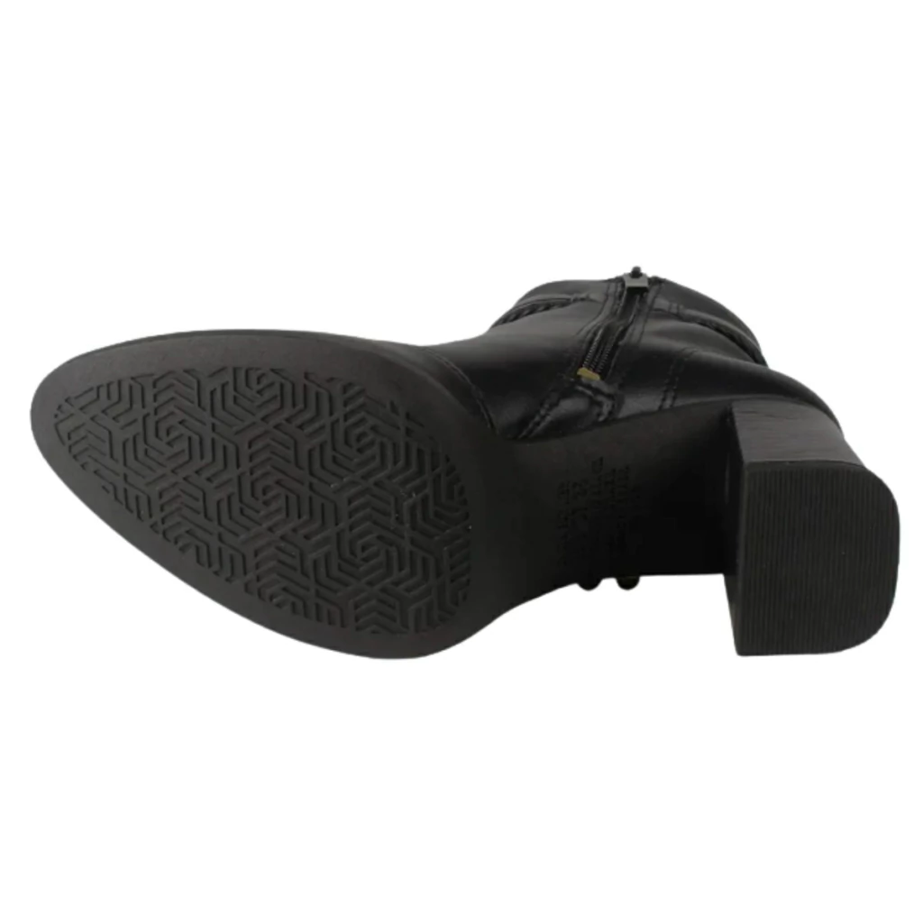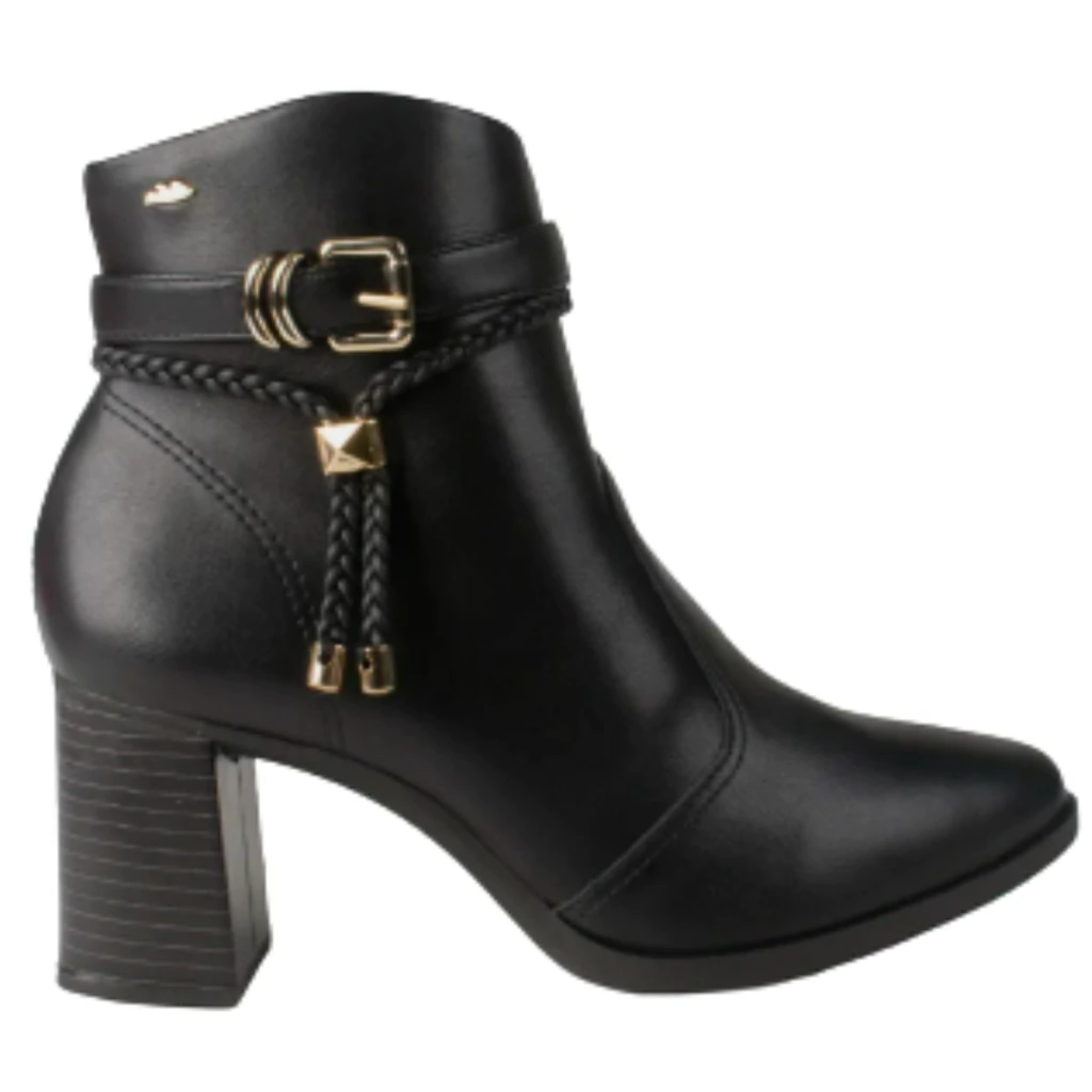 O bico fino confere um ar refinado, enquanto o salto bloco de aproximadamente 7,5 cm oferece estabilidade e conforto para o uso prolongado. O fechamento em zíper lateral facilita o calce, proporcionando praticidade. Internamente, conta com forro têxtil macio e acolchoado, ideal para manter os pés confortáveis durante todo o dia. O solado em borracha ou micro expandido é antiderrapante, promovendo segurança ao caminhar.