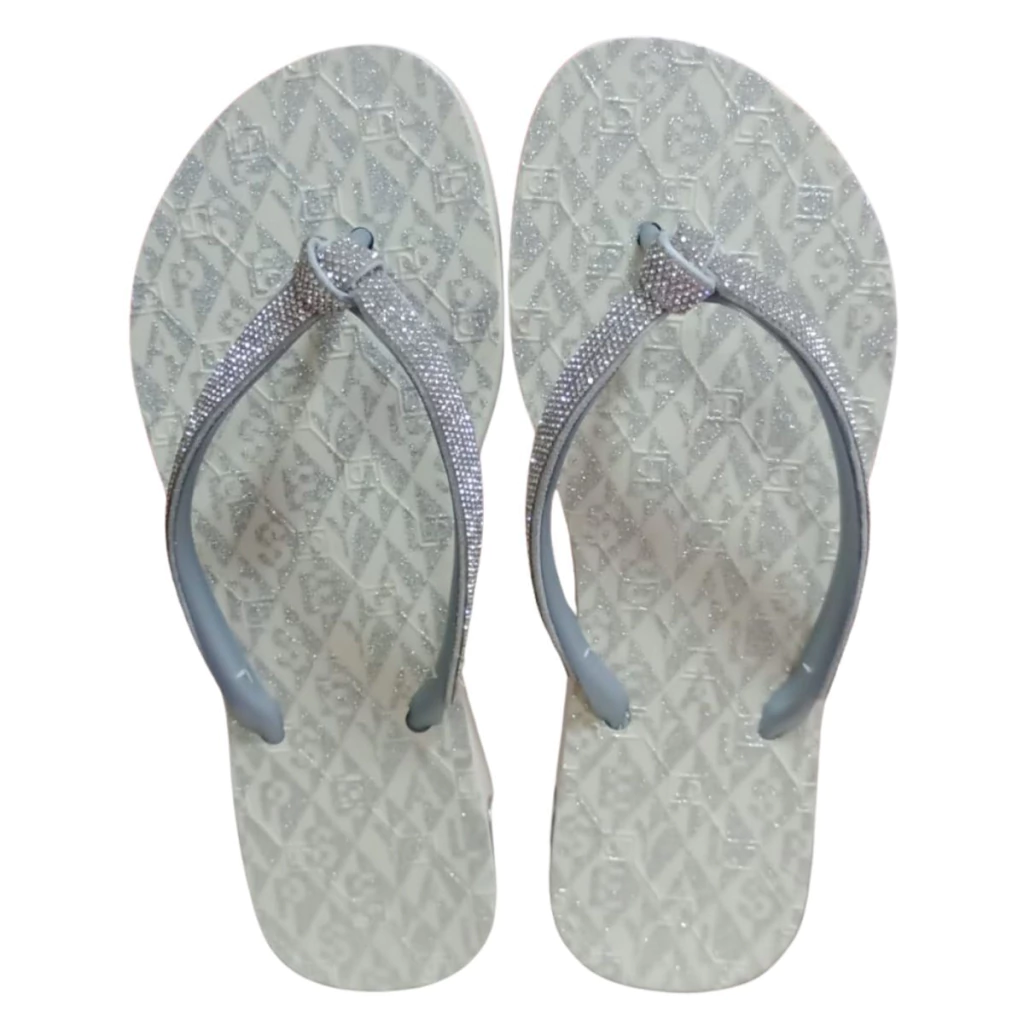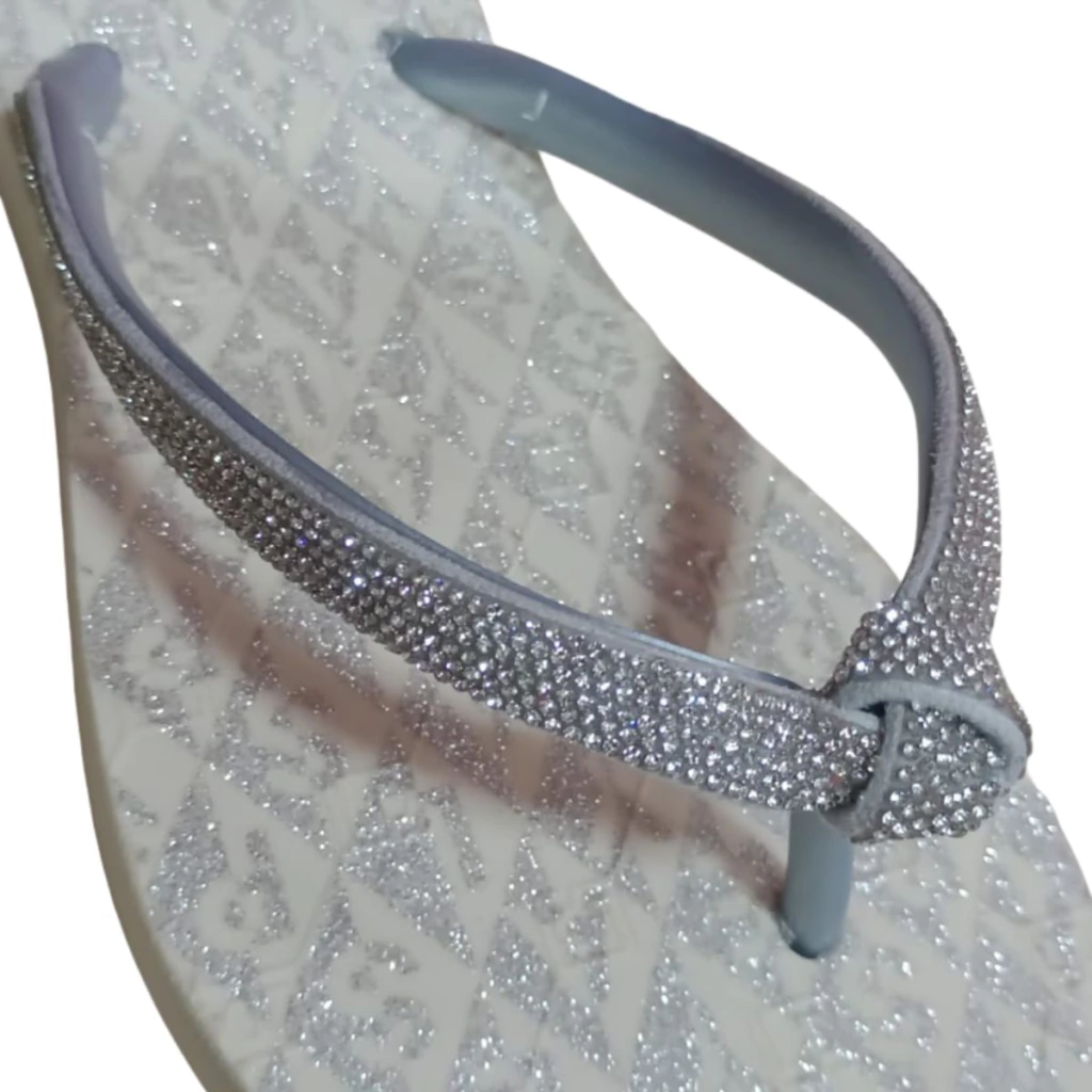 Este calçado une conforto e estilo: a tira larga proporciona boa aderência e estabilidade, enquanto o monograma da Lança Perfume e o acabamento em glitter/reflexo metálico elevam o visual. Ideal para ambientes descontraídos, passeios e momentos em que se quer destaque com praticidade. O solado (presumivelmente anatômico ou com leve elevação) favorece o uso prolongado com conforto.