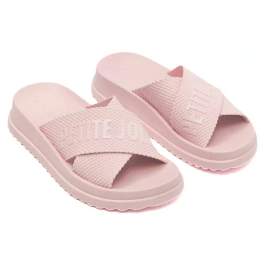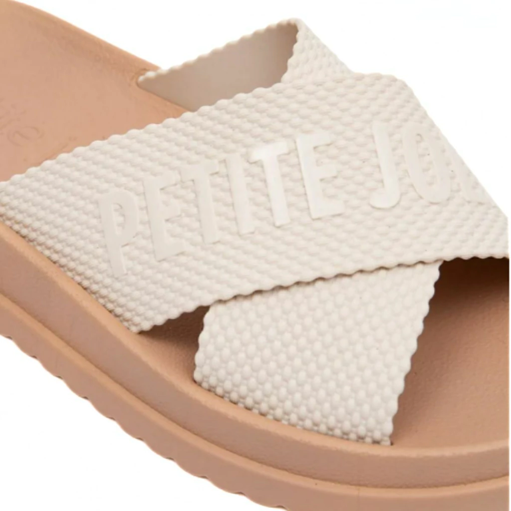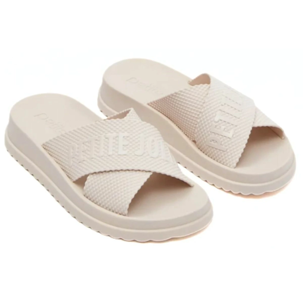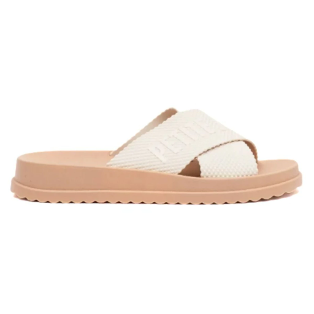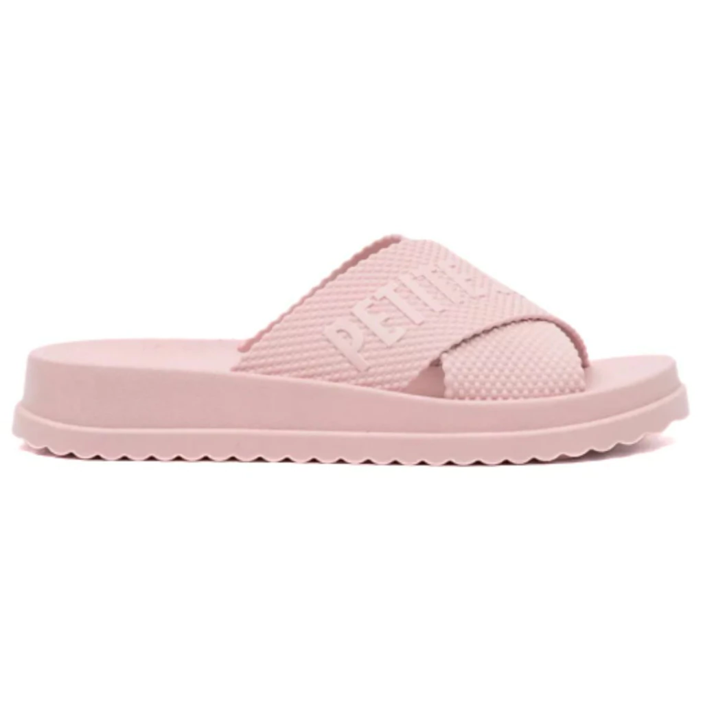 Chinelo Feminino Petite Jolie Smash PJ6812II é um modelo de chinelo slide feminino da marca Petite Jolie, conhecido por seu design moderno e conforto excepcional. Fabricado com o material exclusivo J-Lastic Soft, um PVC expandido mais macio e impermeável, o chinelo possui duas tiras largas cruzadas sobre o pé com texturas e aplicação do logo da marca em destaque. O solado é levemente tratorado, proporcionando maior aderência e segurança ao caminhar. Com altura de salto de aproximadamente 3 cm, é ideal para uso diário, seja em ambientes urbanos ou na natureza.