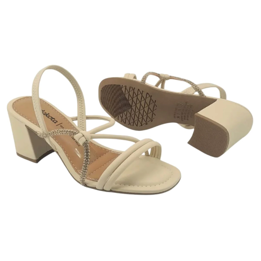 Sandália feminina da marca Dakota, modelo Y9961, com salto bloco médio (≈ 6,5 cm) e tiras finas com acabamento em brilho — uma das tiras traz strass ou textura brilhante que dá um toque sofisticado. O calce é fácil graças à tira elástica no calcanhar (sem fivelas ou cadarços), ideal para quem busca praticidade e conforto. Confeccionada em material sintético, oferece solado emborrachado e palmilha macia, garantindo segurança e conforto nos pés. É uma peça versátil, que une elegância e praticidade, perfeita para ocasiões casuais, passeios e eventos informais.