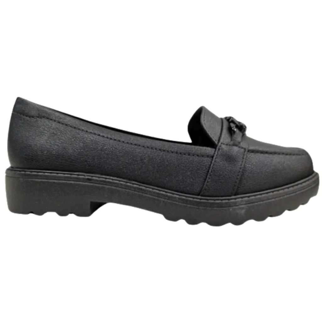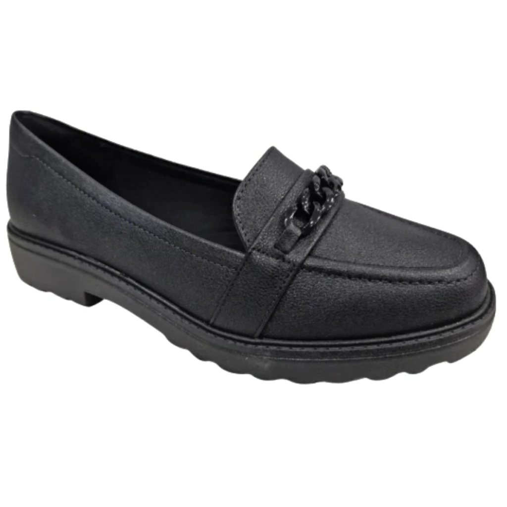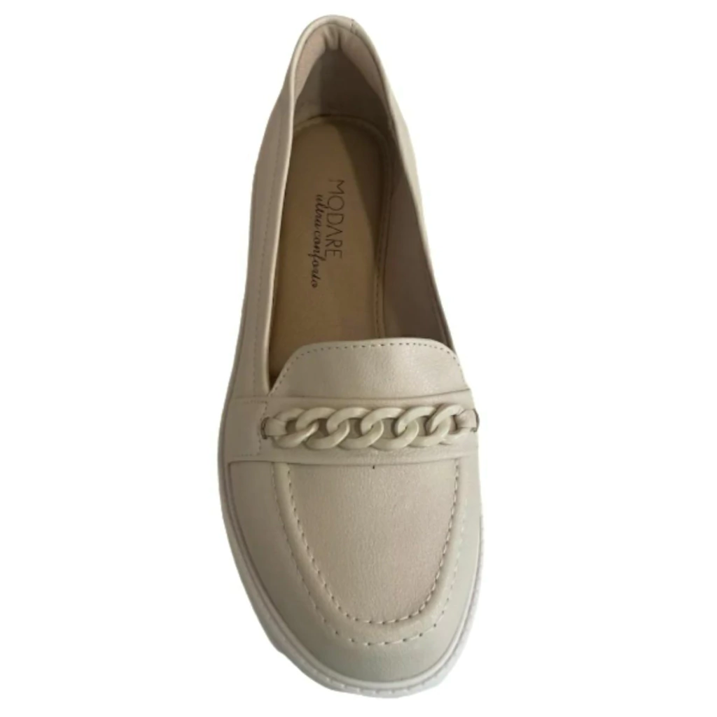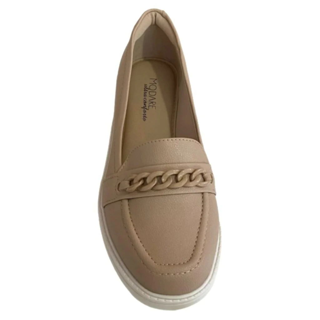 Mocassim feminino Modare Ultraconforto modelo 7357.111, confeccionado em napa sintética de alta qualidade, com bico redondo e aplicação de corrente metálica frontal. Possui palmilha ultraconforto que proporciona conforto durante todo o dia, forro têxtil macio e solado emborrachado com frisos antiderrapantes, garantindo segurança ao caminhar.