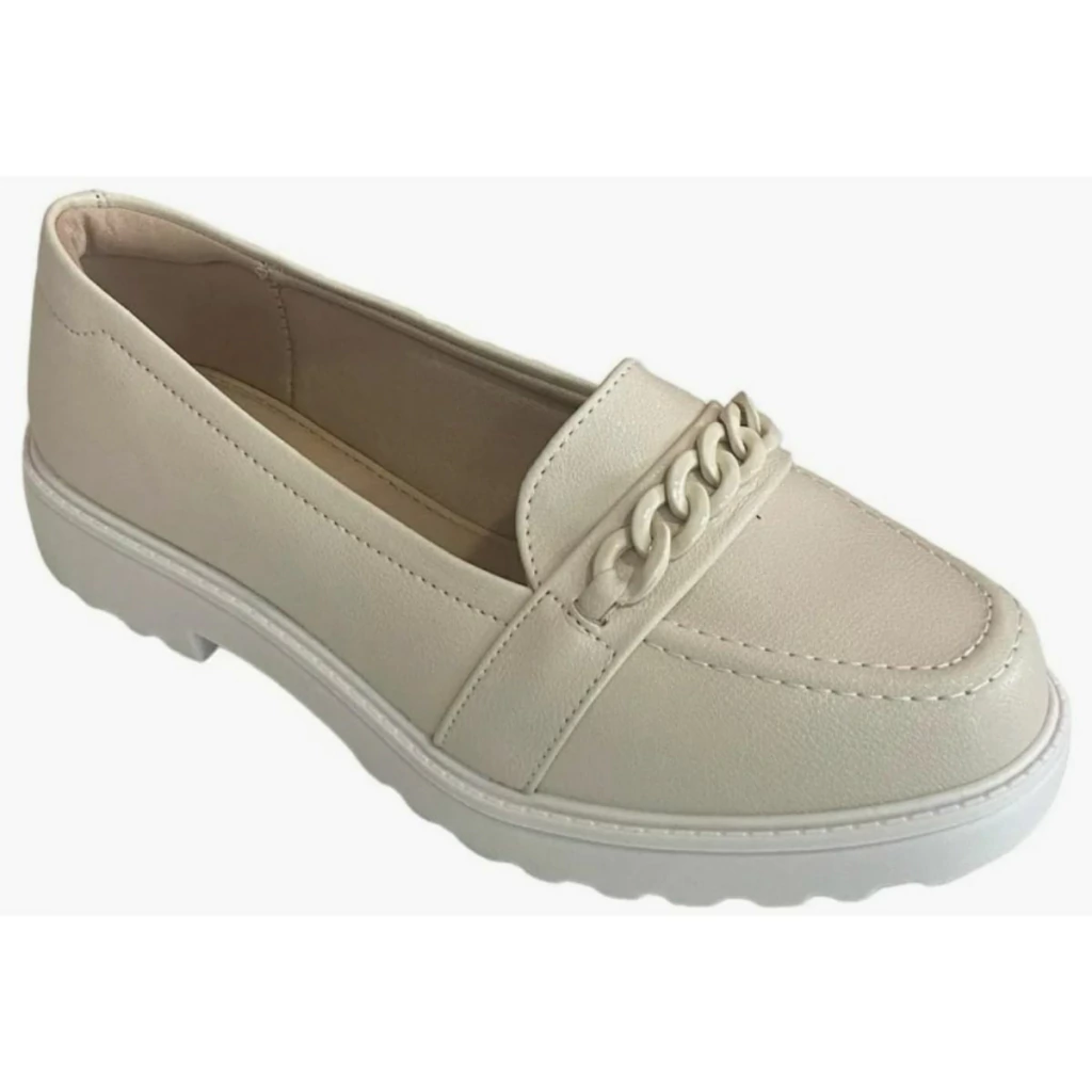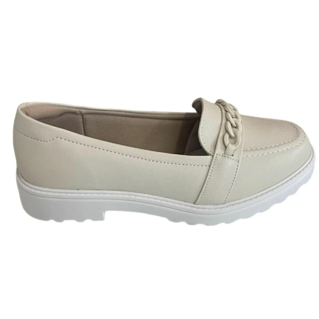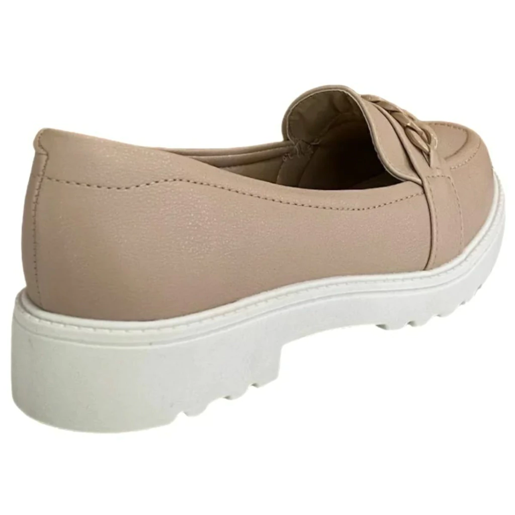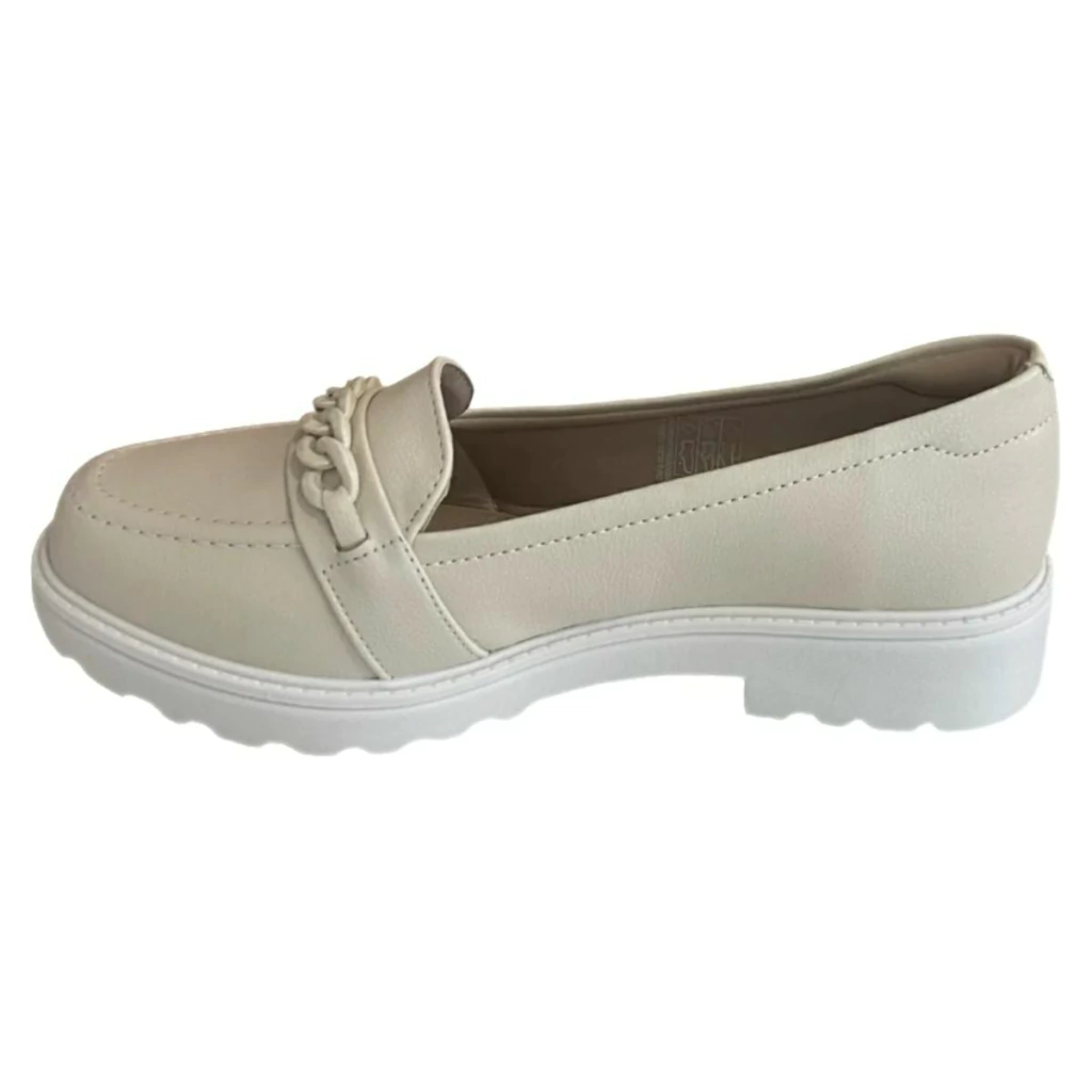 Mocassim feminino Modare Ultraconforto modelo 7357.111, confeccionado em napa sintética de alta qualidade, com bico redondo e aplicação de corrente metálica frontal. Possui palmilha ultraconforto que proporciona conforto durante todo o dia, forro têxtil macio e solado emborrachado com frisos antiderrapantes, garantindo segurança ao caminhar.