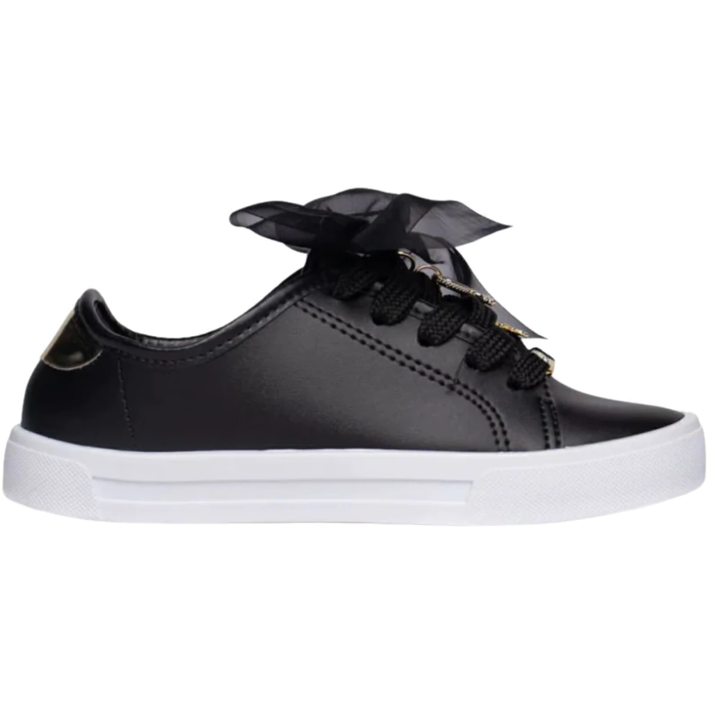 Palmilha em espuma macia e forro têxtil conferem conforto, enquanto o solado em PVC garante leveza e durabilidade. A parte traseira tem acabamento sofisticado em dourado, e os cadarços terminam com pingentes, mantendo a feminilidade sem perder a praticidade para brincar.