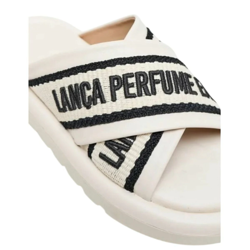 Seu cabedal é composto por tiras largas de gorgorão cruzadas, exibindo o logo em relevo da Lança Perfume, um detalhe sofisticado que traz personalidade ao visual. O solado, além de garantir estabilidade, proporciona máximo conforto para o uso diário.