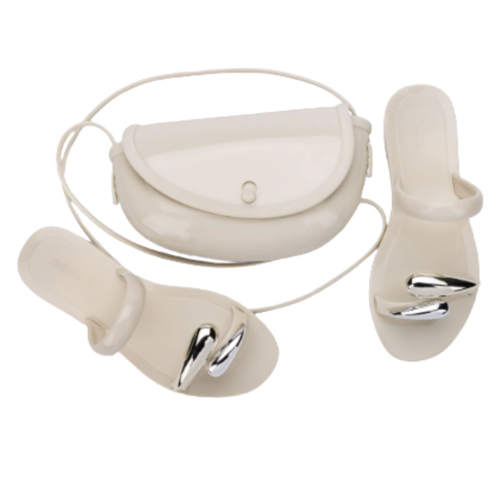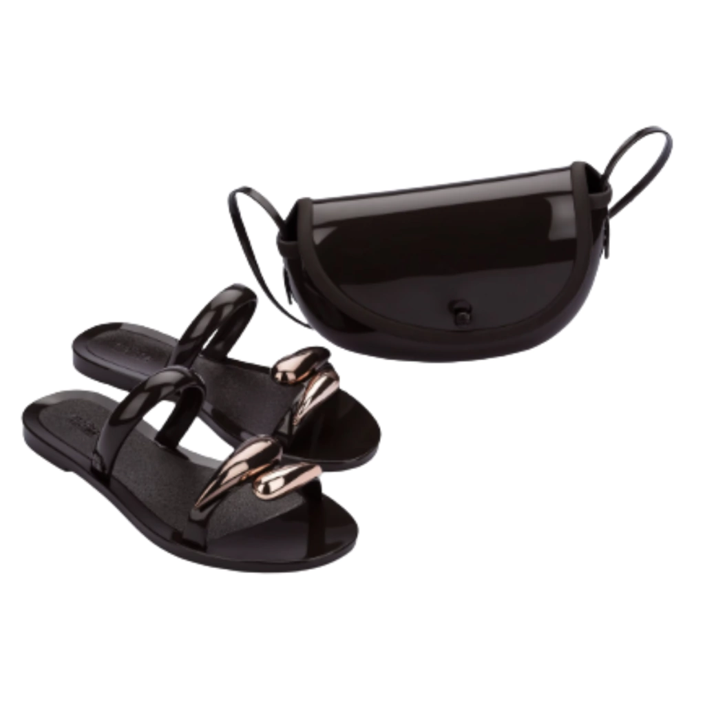 Sandália feminina da linha Eden da Melissa — referência 37943. Modelo slide confeccionado em Melflex®, material exclusivo da marca que oferece conforto, flexibilidade e acabamento elegante. O kit acompanha bolsa compacta, ideal para usar em conjunto e compor um visual moderno com praticidade. Design anatômico, tira larga no peito do pé e solado plano com perfil confortável. Disponível em várias cores e tamanhos femininos padrão da Melissa.